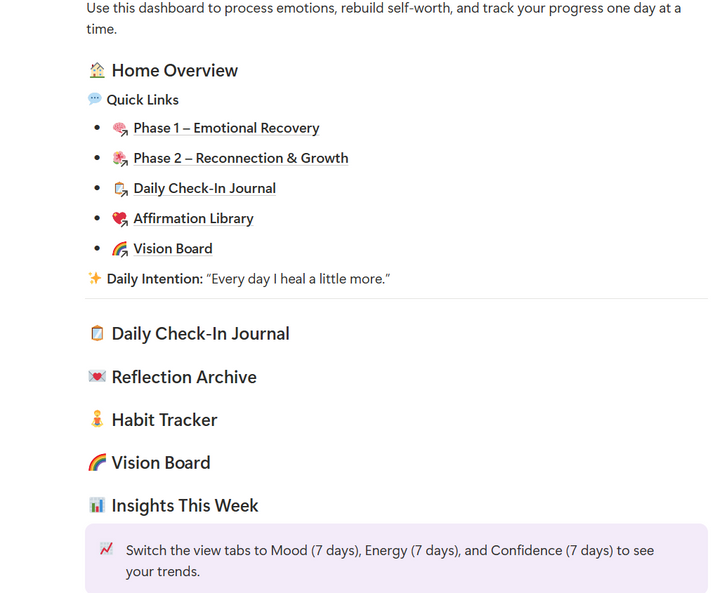 This isn’t just a set of PDFs — it’s a complete, interactive experience that helps you process, rebuild, and rise stronger than ever. From your daily reflections to your 3-phase healing roadmap, every tool works together to help you: