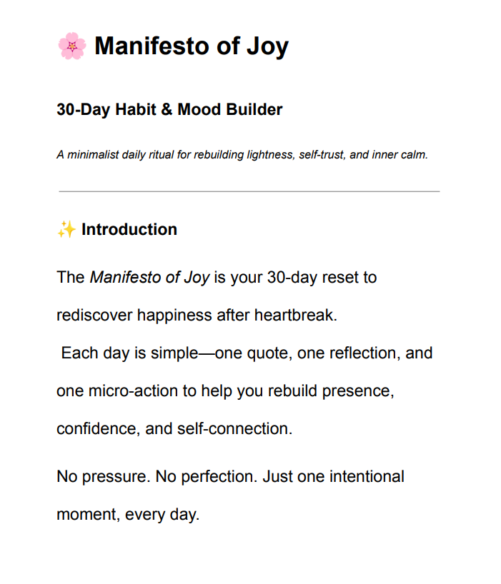 🌸 Manifesto of Joy – A 30-day ritual to rebuild lightness, gratitude, and inner calm.